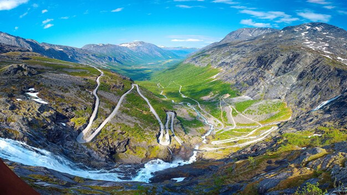 • Sogndal – Geiranger (Noruega) 217 km Partiremos de Sogndal para Geiranger onde já avistamos impressionantes fiordes e encostas de montanhas “caindo” direto no mar. O trajeto combina estradas de curvas suaves com longos túneis escavados nas montanhas, onde cada saída de túnel revela um novo cenário: lagos cristalinos, picos nevados ou vales verdes. Passando pela região de Stryn começam os visuais mais emblemáticos: montanhas altas, geleiras à vista e rios de degelo com água azul-turquesa. O Stryn Sommerskisenter é famoso por ter neve mesmo no verão. E finalizando nosso trajeto do dia, os últimos quilômetro são pura emoção. A estrada serpenteia montanha abaixo, com curvas fechadas e miradouros incríveis. O Flydalsjuvet é uma das paradas obrigatórias para ver o fiorde de Geiranger lá do alto.